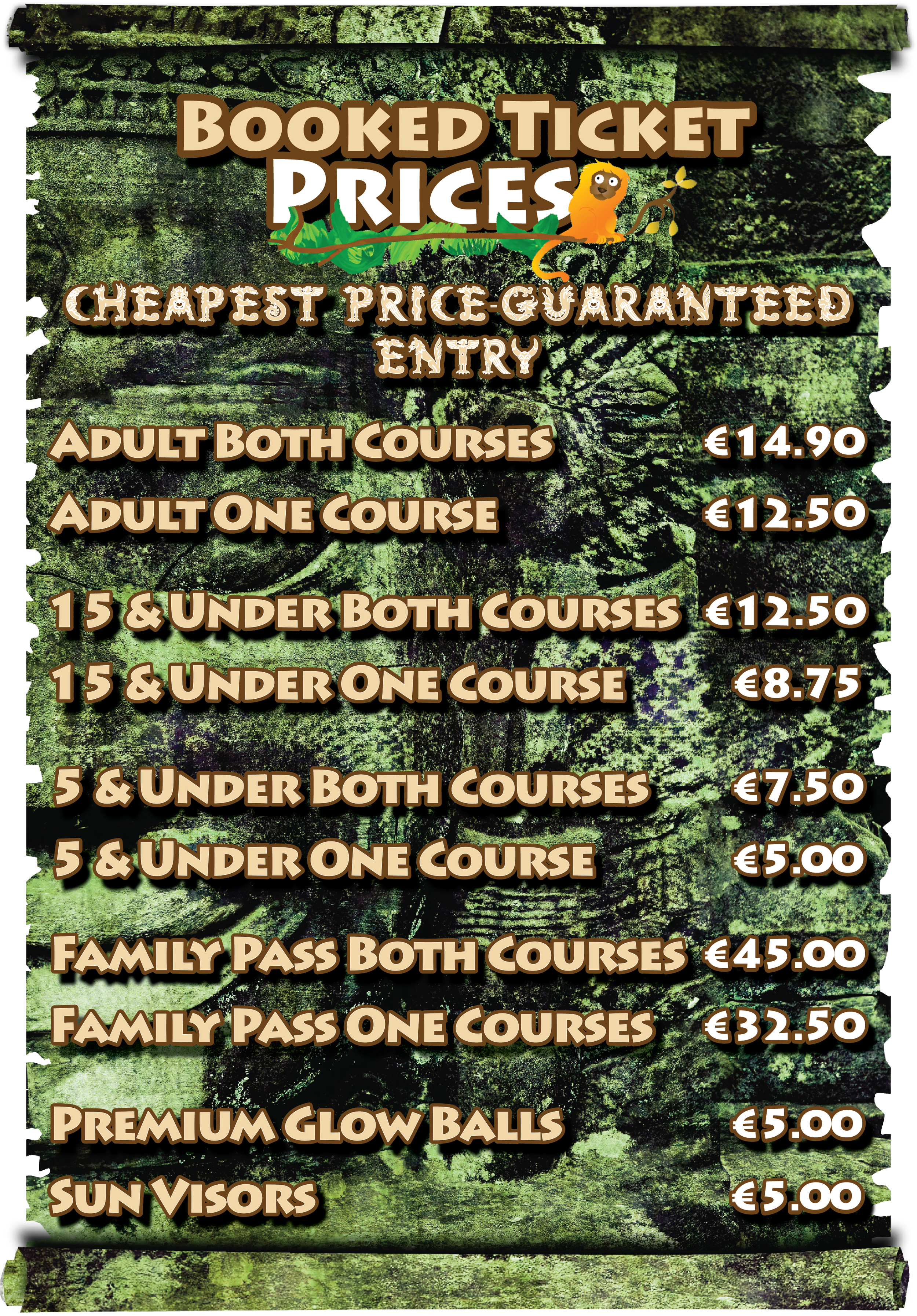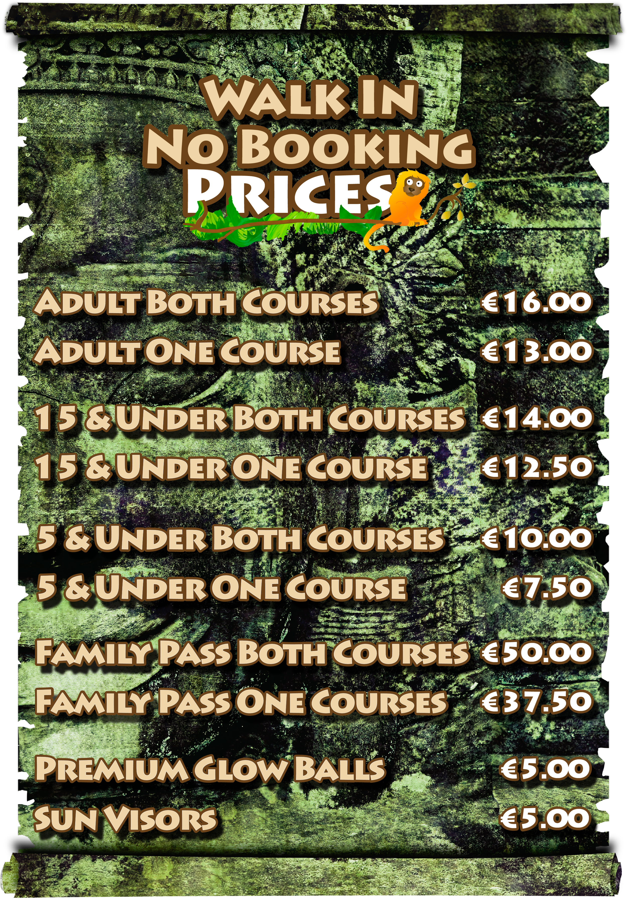 No booking required, simply turn up(we'll provide the clubs and balls) and get playing on our Aztec and Mayan themed 18 hole courses. Walk through our jungle environment and experience mysterious voices and more as you golf. Each course takes approximately 45 mins to play and in between courses treat yourself to pizzas, chicken wings, coffees, ice creams or even beers or wines in our Canopy Cafe or have fun in our mini arcade and maybe even win yourself a prize!